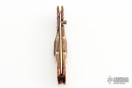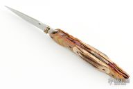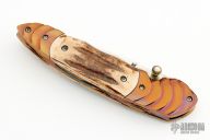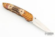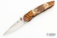 This linerlock (please let us now if you recognize this maker) features a satin finished blade with brass thumbstud with mammoth ivory inlay. The handle has carved and anodized titanium bolsters, stag scales, fileworked and anodized titanium liners and backspacer with black lip pearl inlay. Comes with a zippered case. Excellent condition.