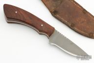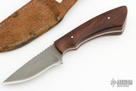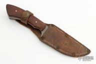 This Model from the late 1970's from 440C steel stock. This knife was rehandled approximately 2010 at no extra charge to its owner when Shiva Ki fashioned select Cocobolo wood for the handle. The small knives are very hard to come by as few have survived and have not been seen up for sale in a long time. The thumb notches on the top of the blade are added comfort and control when used to skin animal and provides a non-slip surface for the thumb. This is exceptional and unique piece. Shiva Ki stands by all of his products with free sharpening, re-finishing, and re-handling. Has a little patina and a few light scuffs, otherwise excellent condition. Comes with a brown leather sheath, not original but fits nicely.