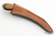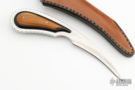 This Claw by Ralph Turnbull features a two-tone etched blade and tang with fileworked spine and the entire tang, .239" blade stock and .870" blade depth, full tang construction. The handle has osage orange over ebony scales with nickel silver pins. Comes with a brown leather sheath. Excellent condition.