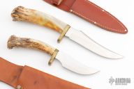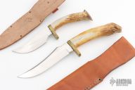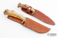 This set of knives features mirror polished blades, textured brass guards and crown stag grips. Both come with brown leather sheaths, they are not original, but they fit. Has some light scratches otherwise excellent condition.