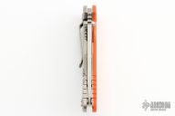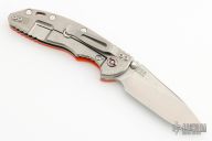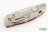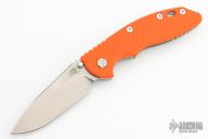 This XM-18 Slicer by Rick Hinderer Knives features a 3.5" stonewash finished blade, notched thumbrest and dual thumbstuds. The handle has a orange G-10 scale, and stonewashed titanium handle/clip. Clip can be mounted for tip up or down carry. Tri-way pivot system.  Nice lockup, and detent. Includes the original box, extra hardware.  New condition.