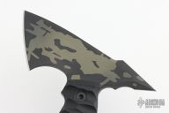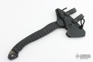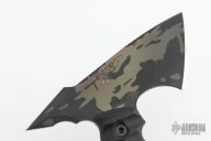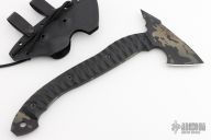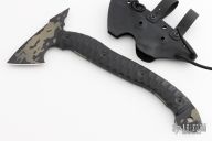 This Bleeding Heart Tomahawk by Half Face Blades features a 2.5" blade with spike at the rear, .219" blade stock, full tang construction. The handle has black G-10 scales. Comes with a kydex sheath and original box. Excellent condition.