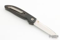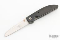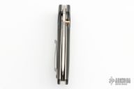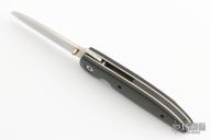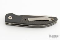 This One Off linerlock folder by Bob Terzuola features a stonewashed blade with notched thumbrest and a gold thumbstud. The handle has black cermet bolsters, carbon fiber scales, bead blasted titanium liners, carbon fiber backspacer, titanium tip up clip. Nice detent, lockup and blade seating. Has a couple light scratches, otherwise excellent condition. Comes with a zippered case.
