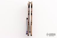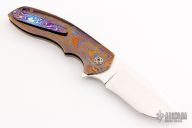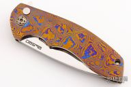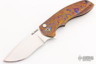 This Gemini 3.5 by Rod Olson features a mirror finished recurve blade with flipper. The handle has a Chad Nichols "Pharoh" mokuti frame, tip up Mokuti clip, anodized titanium screws. Very well done. Rides on bearings, nice detent, lockup and blade seating. Comes with a zippered case. Has a few light scratches, otherwise excellent condition.
