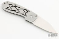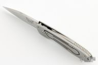"Mind teasing innovation is put into motion in this cutting edge design. An ingenious mechanical LEVITATOR™ system in the stainless steel handle scale leverages the spring/pin system to effectively lock the blade open and closed. The stylish blade shape makes the cut with its high-grade blade steel. A multitude of laser cut and precision machined components come together in a pocket friendly representation of modern engineering wizardry." Has some scuffs, otherwise good condition.