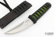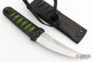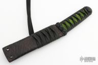 This Kwaiken from Ben Tendick of B.R.T. Bladeworks features a satin finished kwaiken style blade with false top edge, .198" Blade stock 1.279" Blade Depth. The handle has a Turk's head bolster and epoxy soaked tsuka wrap over a green cord underwrap. Includes a Hartsfield style leather over Kevlar sheath. Excellent condition.