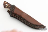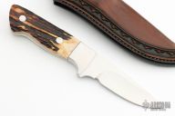 This hunter by Herman Schneider features a hand rubbed satin finish blade with .180" blade stock, 1.083" blade depth, full tapered tang construction. The handle has stainless steel dovetailed bolsters and stag scales with red liners. Great feel in hand. Outstanding work. Comes with a hand tooled brown leather sheath. Excellent condition.