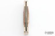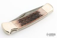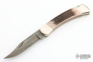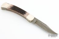 This lock back folder by Buck features a Damascus clip point blade with nail nick. The handle has nickel silver frame and jigged bone inlays. Comes with black leather sheath. Has some light scratches, otherwise excellent condition.