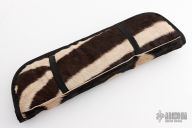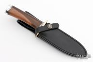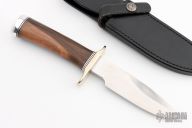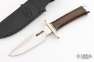 This Combat Companion by Randall Made Knives features a satin finished blade with .214" blade stock and 1.1861" blade depth, 3" sharpened top edge, hidden tang construction. The handle is comprised of a nickel silver double guard, black/duralumin spacers, Macassar Ebony grip, duralumin butt. Includes a black leather sheath and a zippered case. Excellent condition.
