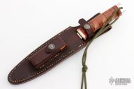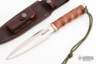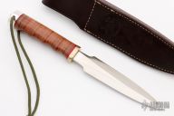 This Model 2-6 Fighting Stiletto from Randall Made Knives has a double edged blade with .210" blade stock and 1.179" blade depth, hidden tang construction. The handle has a reduced brass hilt and aluminum butt cap with lanyard hole, stacked leather handle with right hand finger grooves, and red spacers. Comes with a waxed brown leather sheath and Randall zippered case. Excellent condition.
