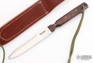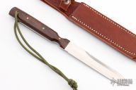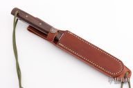 The Model 10-5 by Randall is a Crider Special with spearpoint stainless blade with notched thumb and finger rests, sharpened top edge with sawteeth, .114" blade stock and .825" blade depth, full tang construction. Double finger groove and a rosewood handle with brass pins. Brown leather sheath is stamped "Jack Crider Special". Comes with a Randall zippered case. Excellent condition. Hard to find.