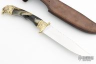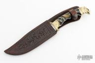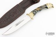 This Fixed Blade by Nikolaos Palamianakis features a polished clip point blade with fuller and fileworked spine. 0.215" blade stock and 1.131" blade depth, hidden tang construction. The handle is comprised of a brass guard with stabilized sheep horn scales over a stainless steel frame. Includes a hand tooled brown leather sheath. New from maker.
