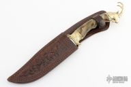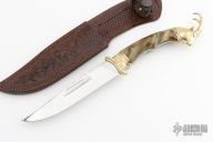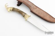 This Fixed Blade by Nikolaos Palamianakis features a polished clip point blade with fuller and fileworked spine. 0.210" blade stock and 1.145" blade depth, hidden tang construction. The handle is comprised of a brass guard with stabilized sheep horn scales over a stainless steel frame. Includes a hand tooled brown leather sheath. New from maker.