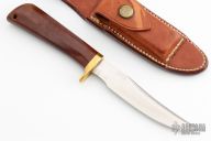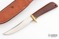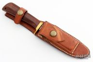 This Early Clip, Jimmy Lile, was built in the late 1960's. This knife features a clip point blade with a false top edge and a hidden tang. .157" Blade Stock 1" Blade depth. The handle is is composed of a brass guard complemented by a sculpted micarta handle with a thong hole towards the rear of the knife. This knife includes a Johnston F45 replacement leather sheath and a padded zippered case. The knife appears have been resharpened however the knife is in excellent condition given its age.