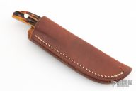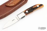 This Stiff Horn by John Young features a mirror finished drop point blade, .155" blade stock and .663" blade depth, full tapered tang construction. The handle has mirror polished stainless steel bolsters, stag scales with red liners. Comes with a brown leather sheath. Excellent condition.