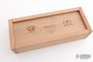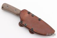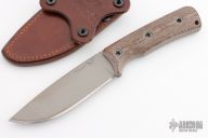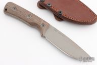This Tsati by RMJ Tactical features a dark grey coated drop point blade with milled bevels and notched thumbrest, .160" blade stock and 1.279" blade depth, full tang construction. The handle has tan linen micarta scales. Comes with a brown leather sheath, original wooden box and COA. Excellent condition.