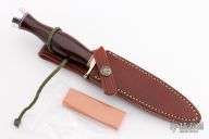 This Model 2-5 Letter Opener or Boot Dagger by Randall Made Knives features a double-edged satin finished blade with .160" stock and 1.059" blade depth, hidden tang construction. The handle has a nickel silver guard with a dark maroon linen micarta grip with a duralumin butt and red/white/blue spacers. Comes with a brown leather sheath and a Randall zippered case. Excellent condition.