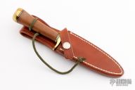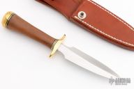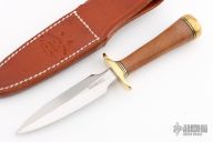 This Model 2-4 by Randall Made Knives features a satin finished double edged blade, .161" blade stock and .934" blade depth, hidden tang construction. The handle has brass guard and butt, walnut grip with black/brass spacers. Comes with brown leather sheath and a Randall zippered case.