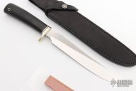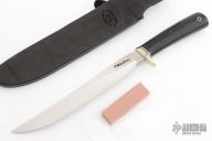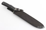 This Model 6-9 Large Fillet by Randall Made Knives features a satin finished blade with notched thumbrest, .168" blade stock and 1.176" blade depth, hidden tang construction. The handle has a nickel silver guard, black linen micarta grip with black/duralumin spacers, lanyard hole. Comes with a black leather sheath and a Randall zippered case. Excellent condition.