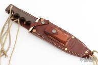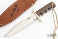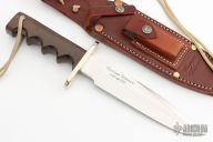 This Model 14 by Randall Made Knives features a satin finished stainless steel blade with sharpened top edge, .217" blade stock and 1.297" blade depth, full tang construction. The handle has a nickel silver guard, brown canvas micarta finger grip handle with lanyard hole. 500 pieces of this limited edition version of the Model 14 were made. Marked "Vietnam Veteran" and numbered 499 of 500 on back of blade. Comes with a zippered case marked Vietnam Veteran and brown leather sheath that has been signed by Tom Clinton. Excellent condition.