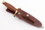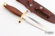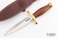 This Model 2-6 Fighting Stiletto from Randall Made Knives has a double edged blade with .193" blade stock and 1.179" blade depth, hidden tang construction. The handle has a lugged brass hilt and brass butt cap, ironwood grip and black spacers. Comes with a brown leather sheath and Randall zippered case. Excellent condition.
