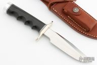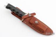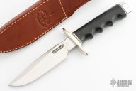 The Model 1-5 by Randall Made Knives has a nickel silver guard, black linen micarta finger grip handle with black/duralumin spacers. Satin finished blade with sharpened top edge, .214" blade stock and 1.089" blade depth, hidden tang construction. Comes with a brown leather sheath and a Randall zippered case. Excellent condition.