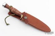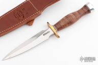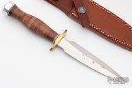 The Model 2-5 by Randall Made Knives is a heavily made dagger or dirk. This knife has a 5" carbon steel satin finished double-edged blade, .162" blade stock and 1.007" blade depth, hidden tang construction. The handle has a brass hilt and duralumin butt, stacked leather grip with red/white/blue spacers. Comes with a brown leather sheath and a Randall zippered case. Has some oxidation on the blade, otherwise good condition.
