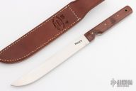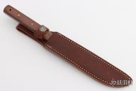 This Model 10 Salt Fisherman and Household Utility features a satin finished upswept blade with notched thumbrest, .102" blade stock and .877" blade depth. The handle has red linen micarta scales with brass pins over full tang construction. Brass lanyard tube with lanyard in pommel. Includes a brown leather sheath and Randall zippered case. Excellent condition.