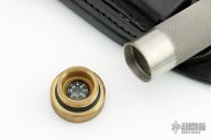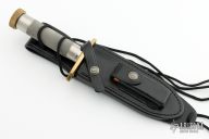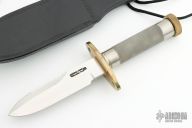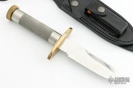 This Model 18-5.5 Attack Survival from Randall Made Knives has a spear point blade with sharpened top edge and sawteeth, .189" blade stock and 1.180" blade depth, hidden tang construction. The handle has a brass guard and knurled butt cap, smooth stainless steel handle. Comes with a black leather sheath and a Randall zippered case. Excellent condition.