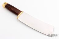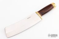 This Meat Cleaver by Randall Made Knives features a satin finished blade with .375" blade stock and 2.417" blade depth, hidden tang construction. The handle has a brass guard, red/white/blue spacers, cocobolo grip, brass butt. Designed for kitchen use. Comes with a Randall zippered case. Excellent condition. One of a Kind?