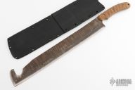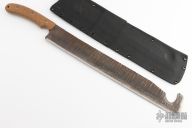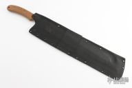 This Machete by BC Bladeworks features a darkened blade with textured flats and spine, notched thumbrest, hook on blade near tip, .162" blade stock and 2.276" blade depth, full tang construction with sculpted coyote G-10 scales. Comes with a kydex sheath. Has some sheath scratches, otherwise excellent condition.