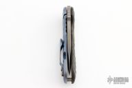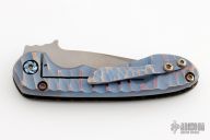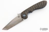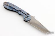 This Scalpel-MF by BC Bladeworks features a Beta Titanium blade with wave feature and notched thumbrest. The handle has brass carbon fiber and anodized and textured titanium frame with matching tip up clip. Nice detent, lockup and blade seating. Excellent condition.