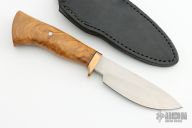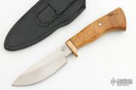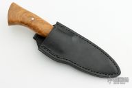 This Hunter by Denis Mura features a hand rub satin finished blade with .210" blade stock and 1.255" blade depth, hidden tang construction. The handle has a brass guard, wood grip with black spacers. Comes with a black leather sheath. Has a few small cracks in the wood near the guard, otherwise good condition.