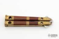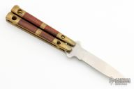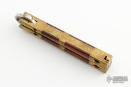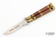 This Manilla Folder Balisong from Taylor/Seto features a satin finished spear point blade with a false top edge. The handle has an integral brass construction with rosewood inlays. Batangus style T latch on pommel. Has a couple light scratches and patina, otherwise excellent condition. Comes with original box.