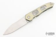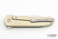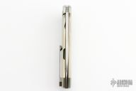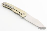This Servo by Brown Knives features a stonewash finish drop point blade and flipper. The handle has a bead blasted and anodized titanium frame, Damascus backspacer, titanium over travel stop and tip up Damascus clip with hidden screws. Damascus inlays. Nice detent, blade seating and lock up. Rides on bearings. Comes with original hard case with COA. Excellent condition.