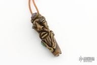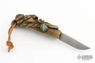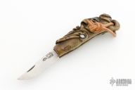 This knife by Opinel has been customized by Jean-Marc Laroche, it features a satin finished blade with nail nick. The handle is a "Tiki Man" with hematite eyes, amethyst inlay on his head, green stone inlay also. Excellent condition.
