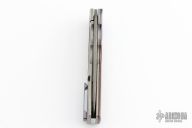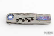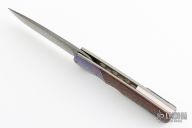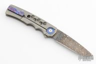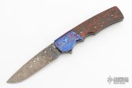 This Mini Hunter Flipper by Jason Clark features a Damascus blade with a notched flipper. The handle has a Timascus dovetailed bolster, Fatcarbon scales, tumble finished titanium liner, satin finished stainless steel backspacer, tip up satin finished Timascus clip. Timascus pivot collar. Rides on IKBS, nice detent, lockup and blade seating. Comes with a leather slip sheath, zippered case and COA. Excellent condition.
