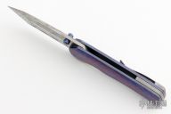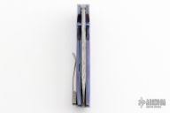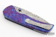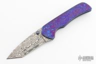 This Harley by David Freeman features a drop point recurve Loki Damasteel blade with dual Timascus thumbstuds. The handle is comprised of Lava Lamp Timascus scales, anodized titanium liners, floating Damasteel backspacer, and Damasteel clip positioned for tip up carry. All hidden hardware. Very nice action, detent, and blade seating. Comes with Zippered case, COA and patches. Excellent condition.