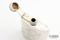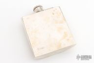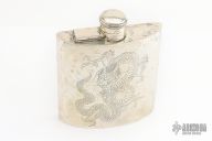 This sterling silver flask has a dragon engraved on the front. Half circle shaped. Has some light scratches and patina, otherwise excellent condition. Has hallmarks on the back and bottom, but I don't know who they are for.