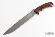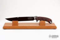 From the Buck Heritage Collection, this Limited Edition Hoodlum fixed blade features a collectible design from late knife-making master Ron Hood. This beautiful piece is outfitted with checkered brown cocobolo wood handles and a black polished blade.  .227" Blade Stock.  1.396" Blade Depth. It is limited to a run of 500 items and includes a rich mahogany knife display stand.  S/N 191/500. Includes the original box, papers and wooden display stand. Excellent Condition.