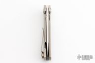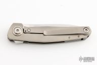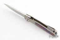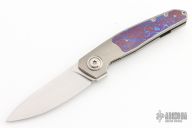 The Isola from Jens Anso features a hand rub satin finished blade with notched flipper. The handle has a milled titanium frame with timascus inlay, titanium pivot collars and screws, zirconium backspacer with lanyard hole and a titanium clip positioned for tip up carry.  Comes with original box and COA. Rides on bearings, nice detent, lockup and blade seating. New from maker!