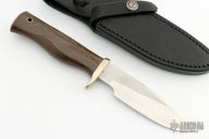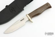 The Model 28 by Randall Made Knives is an excellent skinning and outdoors knife. Has a satin finished drop point blade with false top edge and notched thumbrest, stainless steel blade, .163" blade stock and 1.152" blade depth, full tang construction. The handle has a brass guard, green linen micarta handle and a lanyard hole at the butt. Comes with black leather sheath and a zippered case.  Excellent Condition.