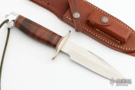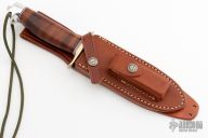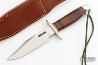 The Model 15 was designed especially for air crew survival and combat purposes in cooperation with U.S. Marine Corps Equipment Board. This knife has a 5.5" blade with .202" blade stock and 1.247" blade depth, cut down tang (hidden tang).  The handle has a nickel silver guard and duralumin butt, stacked leather grip, red/white/blue spacers, lanyard hole, tang nut. Comes with a brown leather sheath and a zippered case. Excellent condition.