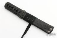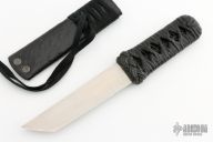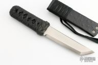 This Kwaiken by Phill Hartsfield features a satin finished chisel ground tanto blade, .124" blade stock and 1.235" blade depth, hidden tang construction. The handle has epoxied cord wrap over black cord. Comes with a paper lined, black leather covered metal scabbard. Excellent condition.