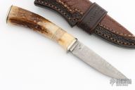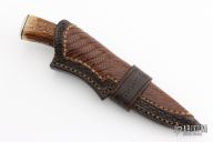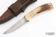 This hunter by Larry Fuegen features a Damascus drop point blade with .225" blade stock and .775" blade depth, hidden tang construction. The handle has a nickel silver guard, stag grip with walrus ivory and oosic spacers, nickel silver butt. Comes with a very nice hand tooled brown leather sheath with lizard skin inlay. Excellent condition. Comes with a zippered case.