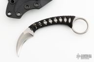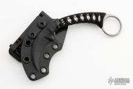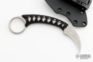 This PiKa is a Doug Marcaida design produced by Bastinelli Knives, it features a chisel ground stonewashed hawkbill blade with notched thumbrest and swedge, .150" blade stock and .678" blade depth, full tang construction. The handle has black wrap with a bronze menuki. Comes with kydex sheath with belt clip and a zippered case. New from maker.