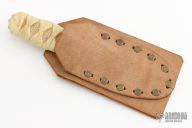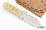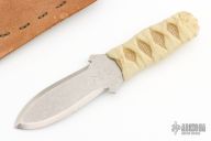 This Dagger by Phill Harsfield features a double edged blade, .092" blade stock and 1.078" blade depth, full tang construction. The handle has epoxy soaked cord wrap. Comes with a brown leather sheath and a Velcro case. Excellent condition.