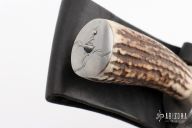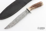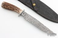 This Fighter by Master Smith Ed Caffrey features a Mosaic Damascus blade with false top edge, .194" blade stock and 1.332" blade depth, hidden tang construction. The handle has an engraved stainless steel guard and butt, stag grip. Comes with a hand tooled black leather sheath and a zippered case. Has a couple light scratches, otherwise excellent condition. Comes with a photocopy of the sales receipt from the maker dated January 10, 2008.