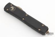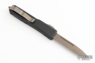 This Ultratech OTF automatic features a bronzed Apocalyptic drop point blade with a standard edge and a black anodized aluminum handle. Matching stainless steel clip, titanium hardware, and glass breaker. Serial number 83844 and dated 08/2017. Comes with original box and papers. Has some light scuffs, otherwise excellent condition.