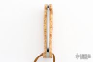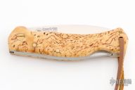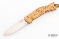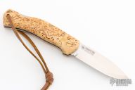 This Lars Falt Lockback by Casstrom features a scandi ground satin finished blade. The handle has curly birch scales with stainless steel liners and backspacer. Comes with original box, receipt and brown leather sheath. Excellent condition.